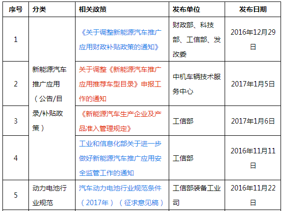 2017年1月8日,中機(jī)中心發(fā)布關(guān)于調(diào)整《新能源汽車推廣應(yīng)用推薦車型目錄》申報工作的通知。該通知主要是根據(jù)2017年補(bǔ)貼新政,調(diào)整新能源汽車推薦目錄申報工作。其中關(guān)于動力電池的內(nèi)容有: