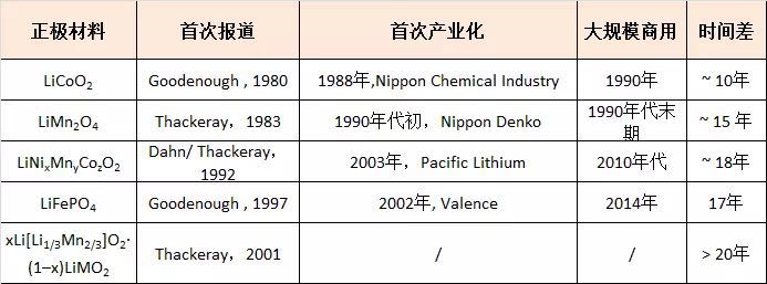 放眼過(guò)去二三十年鋰離子電池的技術(shù)發(fā)展歷程,我們就可以很清楚地看到技術(shù)進(jìn)步的緩慢和艱辛。筆者這里以最具代表性的正極材料的產(chǎn)業(yè)化進(jìn)程來(lái)闡述這個(gè)問(wèn)題。表二比較了幾種主流的鋰電正極材料首次被公開(kāi)報(bào)道的年份、首次被工業(yè)化的時(shí)間以及大規(guī)模商用的時(shí)間。我們可以清楚你看到,這幾種主流正極材料從最開(kāi)始被公開(kāi)報(bào)道到大規(guī)模生產(chǎn)與應(yīng)用,所經(jīng)歷的時(shí)間跨度其實(shí)是越來(lái)越長(zhǎng)了!
