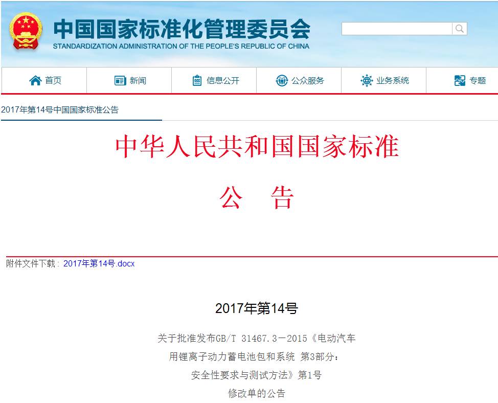 中國(guó)儲(chǔ)能網(wǎng)訊:2017年6月6日,國(guó)標(biāo)委發(fā)布2017年第14號(hào)文件,批準(zhǔn)發(fā)布GB/T31467.3-2015《電動(dòng)汽車(chē)用鋰離子動(dòng)力蓄電池包和系統(tǒng)第3部分:安全性要求與測(cè)試方法》第1號(hào)修改單公告,自2017年7月1日起實(shí)施。