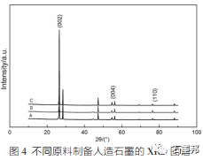 圖4是不同原料、相同制備工藝制成的三種人造石墨A、B、C的XRD圖譜,由圖4可知:A、B、C三種材料的主峰位置基本相同,均位于26°2θ角附近,說明經過高溫石墨化處理后的A、B、C三種材料形成了石墨晶體的六方晶型結構。