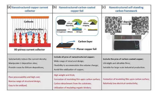 鋰粉末和表面改性的鋰箔可以作為平面鋰箔的替代物,以延遲枝晶的產(chǎn)生。負(fù)極的表面積大大增加以提供相當(dāng)大的沉積位置,從而在一段時(shí)間內(nèi)抑制枝晶生長。然而,鋰箔的表面狀態(tài)和粉末之間的邊界不會(huì)持續(xù)很長時(shí)間,并且整個(gè)箔在長時(shí)間循環(huán)中會(huì)變成隨機(jī)分散的鋰微結(jié)構(gòu)的聚集體。相比之下,集流體(CCs)方法取得了較好的表現(xiàn),傳統(tǒng)銅箔被納米結(jié)構(gòu)化的材料代替。之后為了避免納米結(jié)構(gòu)銅的缺點(diǎn),開發(fā)了碳涂覆的銅箔,這些碳涂層都貢獻(xiàn)了更好的電化學(xué)性能,這與其優(yōu)異的導(dǎo)電性、高比表面積和合適的孔徑/體積比具有密切的關(guān)系。與納米結(jié)構(gòu)或碳涂層銅箔相比,自支撐碳膜本身可直接作為CCs,能夠避免有機(jī)粘合劑或碳脫落產(chǎn)生的導(dǎo)電性所帶來的不利影響。