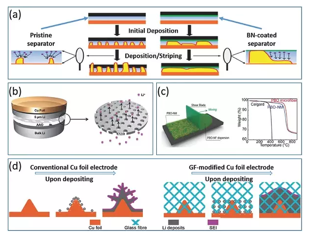 常規(guī)的非織造聚合物或微孔隔膜太脆弱以至于不能抵抗枝晶,對鋰沉積行為沒有顯著影響。這里開發(fā)了改進(jìn)的中間層,以進(jìn)一步保證電池的性能,這主要是通過與枝晶或鋰離子通量的相互作用。這里,中間層具有不同的功能,包括專門設(shè)計(jì)的分離器或附加的保護(hù)層,以彌補(bǔ)分離器的弱點(diǎn)。