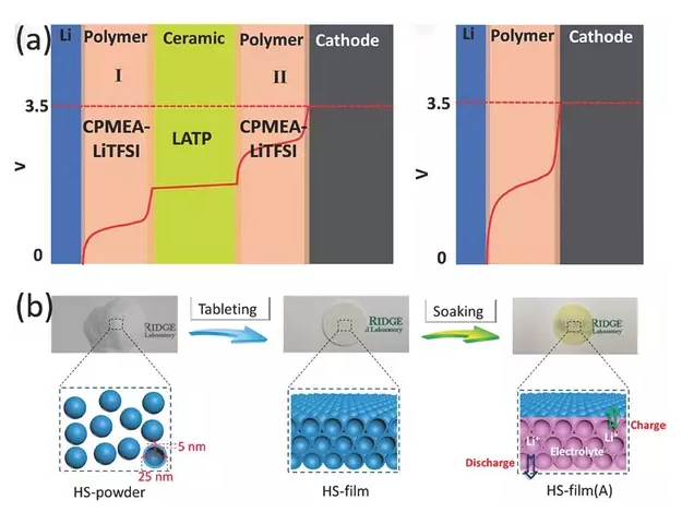 a)聚合物/陶瓷/聚合物-三明治電解質(zhì)(左),內(nèi)部曲線是固體混合電解質(zhì)和單個(gè)固體聚合物電解質(zhì)的電勢分布圖(右);