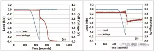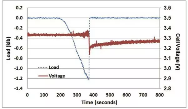 為了方便讀者理解本文,下圖是給出了LFP電池一個(gè)非常典型的成功通過(guò)機(jī)械擠壓測(cè)試(正反饋)的判據(jù),電池?cái)D壓變形達(dá)到一定的程度后,引起了電池內(nèi)短路的發(fā)生,電池電壓迅速下降,檢測(cè)到電壓下降后(0.1V),擠壓力隨之被移除,電池的電壓快速回升,電池沒(méi)有發(fā)生熱失控,則電池通過(guò)擠壓實(shí)驗(yàn)。