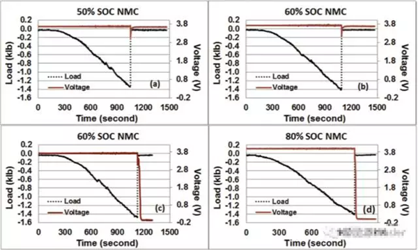 在對(duì)25Ah的NMC電池?cái)D壓-扭轉(zhuǎn)測(cè)試中,發(fā)現(xiàn)50%SoC狀態(tài)下的電池都成功通過(guò)了測(cè)試,如圖a所示,60%SoC狀態(tài)下的電池有三只通過(guò)了測(cè)試,如圖b所示,另外的三只沒(méi)有通過(guò)測(cè)試,如圖c所示,可見(jiàn)60%SoC的電池通過(guò)測(cè)試和不通過(guò)測(cè)試的概率各為50%,而80%SoC的電池則都沒(méi)有通過(guò)測(cè)試,如圖d所示。由此可見(jiàn),60%SoC是NMC電池安全性的一個(gè)分水嶺,低于這個(gè)數(shù)值時(shí)電池相對(duì)是安全的,高于這個(gè)數(shù)值,則電池在機(jī)械濫用的情況下的安全性將大大下降。