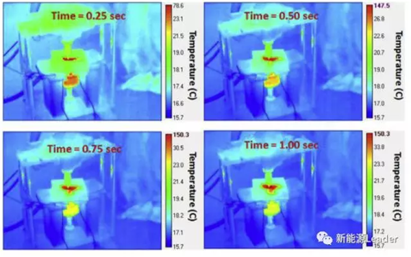 下圖為60%SoC的NMC電池在擠壓-扭轉(zhuǎn)實(shí)驗(yàn)中的熱成像圖,從圖中可以看到在短路發(fā)生后,短路點(diǎn)的溫度在0.5S內(nèi)迅速升高到了147.5 ℃,隨后高溫區(qū)域迅速向周?chē)鷶U(kuò)展,說(shuō)明周?chē)鷧^(qū)域溫度升高并不是由熱傳導(dǎo)導(dǎo)致的,而是高溫引發(fā)了其他的化學(xué)反應(yīng)。而在80%SoC下,NMC電池發(fā)生熱失控的溫度更高,引起周?chē)瘜W(xué)反應(yīng)的速度也更快。