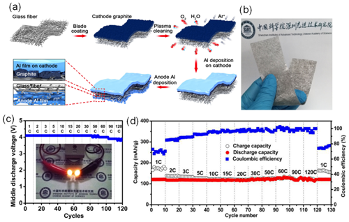 中國儲能網(wǎng)訊:近日,中國科學院深圳先進技術(shù)研究院集成所功能薄膜材料研究中心研究員唐永炳及其研究團隊成功研發(fā)出一種一體化結(jié)構(gòu)設(shè)計的柔性超快充放電池,這種新型結(jié)構(gòu)設(shè)計顯著提升了電池的快充快放特性,同時保持了高的能量密度和循環(huán)性能。相關(guān)研究成果Integrated Configuration Design for Ultrafast Rechargeable Dual-Ion Battery(《一體化結(jié)構(gòu)設(shè)計的超快充放雙離子電池》)已在線發(fā)表于國際期刊《先進能源材料》(Advanced Energy Materials,DOI: 10.1002/aenm.201700913)上,并申請1項國際發(fā)明專利(PCT/CN2017/078205)。