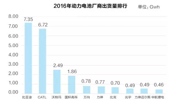 2016年國內(nèi)鋰動(dòng)力電池企業(yè)出貨量合計(jì)達(dá)30.5GWh,同比增長79.4%,而比亞迪、CATL、沃特瑪、國軒高科穩(wěn)居全國前四,占比62.1%,較2015年的54.9%持續(xù)提升,龍頭優(yōu)勢持續(xù)發(fā)酵。