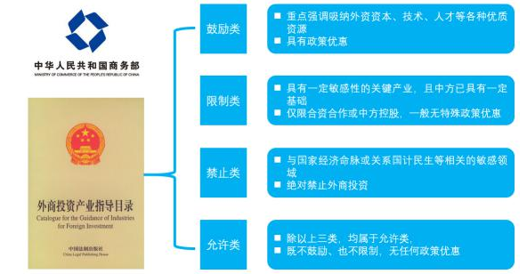 首先我們要看看外商投資目錄的具體分類和作用。眾所周知,《外商投資產(chǎn)業(yè)指導目錄》是我國直接指導核準外商投資的政策,其將外商投資項目分為鼓勵類、限制類、禁止類、允許類四類(項目具體劃分如圖1所示)。簡單而言,商務部通過目錄分類管理實現(xiàn)了外商投資的宏觀管控,是一種兼具計劃經(jīng)濟與市場經(jīng)濟色彩的行政手段。