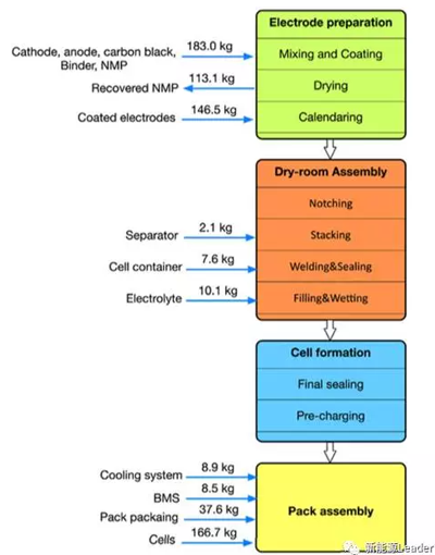 由于電池組的組裝主要由人工完成,因此能耗僅為0.03kWh/kg,因此整個24kWh電池組的電池組裝能耗也僅為0.3GJ。