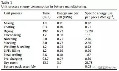 鋰離子電池生產過程中每個步驟的能耗,如下表所示,其中有38%的能量消耗在了電極干燥過程,43%消耗在干燥間的運行中,整個24kWh電池組消耗在單體電池生產過程中的能耗為58.7GJ。