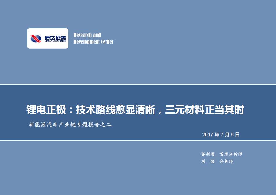 正極材料:鋰電核心材料,市場(chǎng)空間巨大。動(dòng)力電池占整車成本的三分之一到二分之一,是關(guān)乎汽車性能的重中之重。正極材料是制作鋰離子電池電芯的關(guān)鍵原材料,在其成本與質(zhì)量控制等方面都起著決定性作用。正極材料技術(shù)優(yōu)劣漸分,性價(jià)比是關(guān)鍵:三元材料:綜合多維優(yōu)勢(shì),發(fā)展前景廣闊;磷酸鐵鋰:安全性能較好,成本具有優(yōu)勢(shì),客車上應(yīng)用較為廣泛;鈷酸鋰:3C應(yīng)用較多,成本劣勢(shì)不可忽視;錳酸鋰:成本優(yōu)勢(shì)明顯,高溫性能較差。動(dòng)力電池的發(fā)展帶來(lái)正極材料的較大增量市場(chǎng):我們預(yù)測(cè)2017年國(guó)內(nèi)僅動(dòng)力電池帶來(lái)的正極材料市場(chǎng)規(guī)模即可達(dá)到134億元,2020年市場(chǎng)規(guī)模達(dá)到246億元;國(guó)內(nèi)整體正極材料市場(chǎng)規(guī)模2017年達(dá)248億元,2020年達(dá)363億元。全球角度,我們預(yù)測(cè)2017年動(dòng)力電池正極材料市場(chǎng)規(guī)模在443億元左右,整體正極材料市場(chǎng)規(guī)模達(dá)739億元。