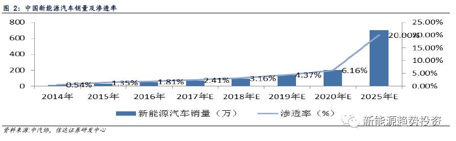 2016年新能源汽車滲透率已經(jīng)達(dá)到1.81%,我們認(rèn)為在政策利好以及行業(yè)發(fā)展的背景下,未來(lái)幾年新能源汽車滲透率會(huì)不斷提升,至2020年預(yù)計(jì)達(dá)到6.16%,2025年預(yù)計(jì)達(dá)到20%。