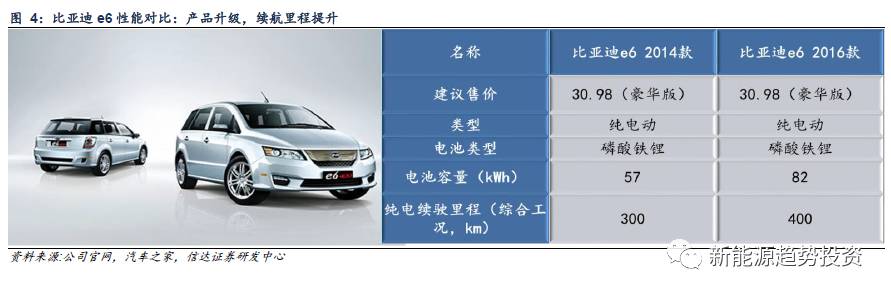 以比亞迪e6車型為例,2014年款e6的純電最高續(xù)航里程(綜合工況法)為300km,而2016年款e6的續(xù)航里程則達(dá)到了400km,擁有很大提升。國(guó)外方面,以nissanLeaf車型為例,2015年款電池容量為24kWh,續(xù)航里程在200km左右。僅一年后2016款的電池容量提升為30kWh,續(xù)駛里程增加。2017年款則加入了快充的性能,半個(gè)小時(shí)之內(nèi)即可從低電量狀態(tài)充至80%。