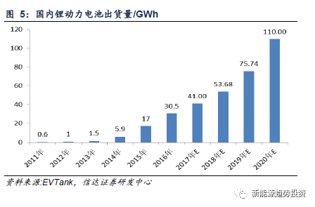 受到新能源汽車行業(yè)大發(fā)展的影響,動(dòng)力電池需求量不斷攀升。根據(jù)EVTank數(shù)據(jù)顯示,2016年,中國(guó)國(guó)內(nèi)鋰動(dòng)力電池出貨量合計(jì)達(dá)到30.5GWh,同比2015年17GWh增長(zhǎng)79.4%。我們預(yù)計(jì)2017年國(guó)內(nèi)動(dòng)力電池需求約為41GWh,2020年需求保守估計(jì)將達(dá)到110GWh。