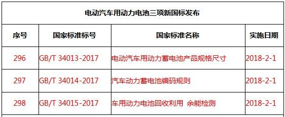 本次GB/T 34013-2017《電動汽車用動力蓄電池產(chǎn)品規(guī)格尺寸》、GB/T 34014-2017《汽車動力蓄電池編碼規(guī)則》、GB/T 34015-2017《車用動力電池回收利用 余能檢測》三項國家標準發(fā)布,使動力電池產(chǎn)品規(guī)格尺寸、編碼規(guī)則和回收利用余能檢測有標準可依,對動力電池行業(yè)規(guī)范發(fā)展具有重要意義,對動力電池企業(yè)乃至新能源汽車產(chǎn)業(yè)都將產(chǎn)生影響。