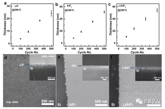 圖1. (a-c)具有不同ALD循環(huán)數(shù)的LiF,AlF3和LiAlF4膜的厚度表征。(d-f)在硅晶片上原子沉積 LiF,AlF3和LiAlF4膜的俯視SEM圖像。嵌入圖像是硅晶片上LiF,AlF3和LiAlF4膜的側(cè)視圖。