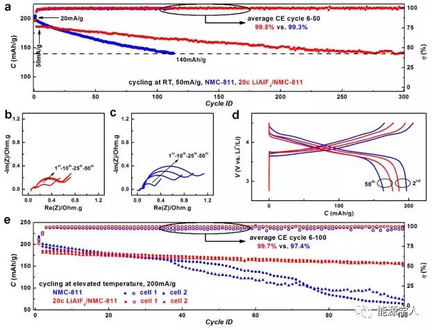 作者將LiAlF4薄膜直接沉積在極片上,而不是在每個顆粒表面。滿足了在寬電化學窗口下工作的要求。作者研究了在2.75-4.50V下,高Ni含量LiNi0.8Mn0.1Co0.1O2(NMC-811)上沉積的涂層效果。在室溫下,具有LiAlF4涂層的NMC-811電極在300次循環(huán)后維持高于140mAh/g的容量(超過300次循環(huán)衰減24%,每循環(huán)0.08%)。對于原始的NMC-811,113次循環(huán)后容量下降到低于140mAh/g(在113個循環(huán)中衰減29%,每個循環(huán)為0.26%)。由于高溫下的循環(huán)穩(wěn)定性差是高Ni含量層狀鋰金屬氧化物最為顯著的缺點。因此,作者對樣品進行了高溫環(huán)境(50℃)的電化學測試。由于在50℃下涂層和NMC-811本身的鋰離子傳導性都會提高,所以以20c的倍率測試。原始NMC-811電極的容量在100個循環(huán)內(nèi)快速衰減低于100 mAh/g。相比之下,具有ALD LiAlF4涂層的NMC-811電極在100個循環(huán)內(nèi)顯示出優(yōu)異的容量保持率。