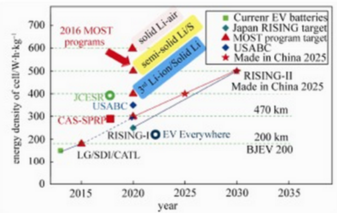 世界各國(guó)先后制訂的高能量密度鋰電池研發(fā)目標(biāo),均在積極地布局鋰硫電池、鋰空氣電池或鋰金屬電池等前瞻性技術(shù)。