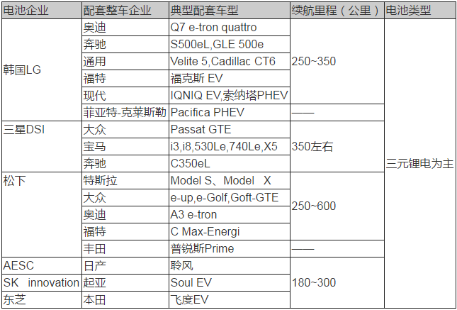 當(dāng)前,全球新能源車市場(chǎng)進(jìn)入蓬勃發(fā)展的關(guān)鍵時(shí)期,主流汽車企業(yè)紛紛布局新能源汽車,鋰電池產(chǎn)業(yè)鏈因此快速成熟將進(jìn)一步推動(dòng)新能源汽車的規(guī)模化應(yīng)用。從全球角度看,典型車企配套車型主要采用日韓動(dòng)力電池,以三元鋰為主,續(xù)航里程基本都達(dá)到或超過350公里的水平。