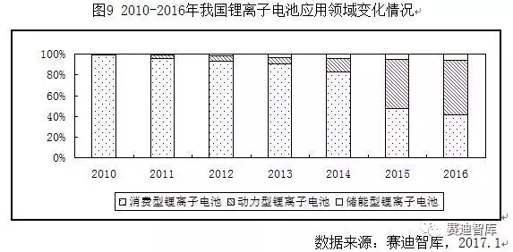 從2015年開(kāi)始,隨著動(dòng)力型鋰離子電池需求迅猛增長(zhǎng),我國(guó)鋰離子電池產(chǎn)業(yè)結(jié)構(gòu)發(fā)生了顯著變化。按照鋰離子電池產(chǎn)品容量計(jì)算,由于電動(dòng)汽車產(chǎn)量迅猛增長(zhǎng),加上電動(dòng)自行車中鋰離子電池滲透率穩(wěn)步提升,動(dòng)力型鋰離子電池市場(chǎng)需求快速提高,2016年動(dòng)力型鋰離子電池市場(chǎng)占比達(dá)到52%,首次突破50%并超過(guò)消費(fèi)型鋰離子電池,而2015年還只有47%;消費(fèi)型鋰離子電池市場(chǎng)占比繼續(xù)下滑,2016年約為42%,2014年和2015年這一占比還分別為83%和48%;儲(chǔ)能型鋰離子電池在光伏分布式應(yīng)用以及移動(dòng)通信基站儲(chǔ)能電池領(lǐng)域的應(yīng)用不斷擴(kuò)大,2016年達(dá)到6%,比起2014年的4%、2015年的5%,一年上一個(gè)臺(tái)階。