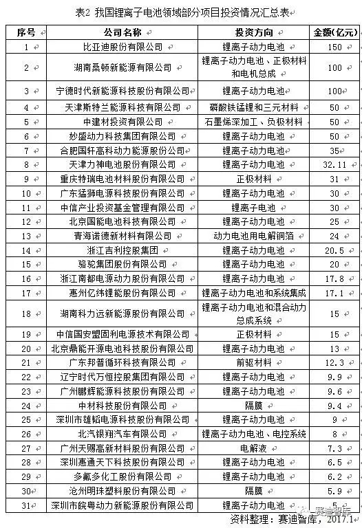 2015年開(kāi)始我國(guó)電動(dòng)汽車呈現(xiàn)井噴式增長(zhǎng)勢(shì)頭,帶動(dòng)了鋰離子動(dòng)力電池市場(chǎng)需求猛增,2016年這一局面繼續(xù)持續(xù),加上“十三五”期間我國(guó)大力發(fā)展電動(dòng)汽車的戰(zhàn)略決策,鋰離子電池產(chǎn)業(yè)投資力度在2016年不減,從上游關(guān)鍵原材料到下游電芯、模組,骨干企業(yè)加快擴(kuò)產(chǎn)步伐,以期在動(dòng)力電池領(lǐng)域搶占有利市場(chǎng)地位。據(jù)不完全統(tǒng)計(jì),2016年國(guó)內(nèi)鋰電產(chǎn)業(yè)投資(含擬投資)超過(guò)1200億元,實(shí)際投資550億元,其中動(dòng)力電池、正極材料、隔膜投資額最多,表2所示為部分投資項(xiàng)目情況匯總表。其中,比亞迪、寧德新能源、國(guó)軒高科、天津力神等國(guó)內(nèi)動(dòng)力電池領(lǐng)軍企業(yè)投資額均在30億元以上。