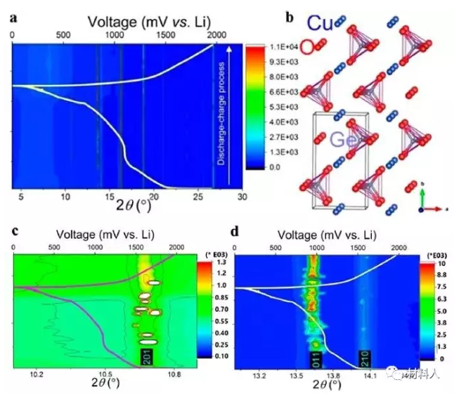 在三元鍺酸鹽中,CuGeO3擁有獨(dú)特的二維層狀結(jié)構(gòu),能提供體積膨脹所需的緩沖空間,還能使得反應(yīng)限制在層內(nèi)形成“微型反應(yīng)池”提高電化學(xué)活性。除此以外,CuGeO3的晶體結(jié)構(gòu)使得充放電可逆,延長了循環(huán)壽命。