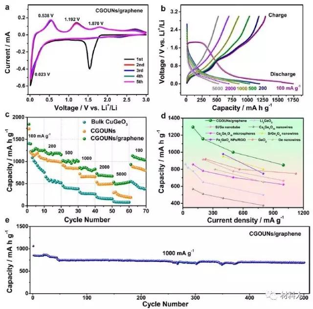 除此以外,石墨烯基底則作為彈性緩沖層、電子傳輸通道和額外的界面儲(chǔ)鋰來源。收益于該多尺度階梯式策略,CGOUNs/石墨烯在100mAg-1電流密度下展示了高達(dá)1295mAhg-1的比容量,良好的倍率特性以及長循環(huán)壽命。