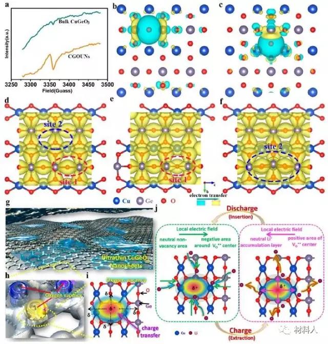 該文章報(bào)道了一種常規(guī)液相剝離法制成的二維CuGeO3超薄納米片(CGOUNs)/石墨烯范德華異質(zhì)結(jié)的鋰電陽極材料。有趣的是,當(dāng)CuGeO3的厚度減少至原子尺度時(shí),由于有較多的表面原子輕易離開了二維晶格,產(chǎn)生自適應(yīng)氧空位。第一性原理計(jì)算表明,產(chǎn)生明顯的電子轉(zhuǎn)移現(xiàn)象,使得電子分布不平衡,在氧空位區(qū)域上產(chǎn)生了局域電場。