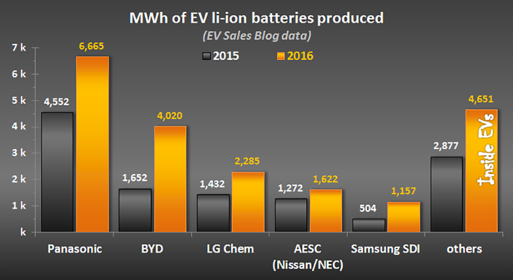 根據(jù)一些市場調(diào)研公司的統(tǒng)計,雖然具體名次有別,但全球動力電池市場份額最高的 3 家企業(yè)大多為松下、比亞迪、LG 化學(xué),日產(chǎn)和 NEC 合資成立的電池公司 AESC 也在前列。