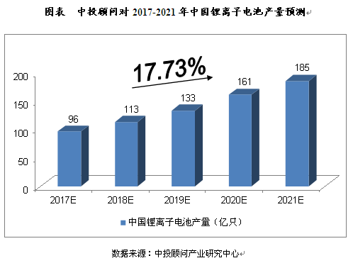 2016年,中國鋰離子電池產(chǎn)量為78.4億只,同比增長35.8%;2017年1-6月,產(chǎn)量達到46.8億只,同比增長40.9%。中投顧問發(fā)布的《2017-2021年中國鋰電池行業(yè)投資分析及前景預(yù)測報告》數(shù)據(jù)顯示:預(yù)計,2017年中國鋰離子電池產(chǎn)量將達到96億只,未來五年(2017-2021)年均復(fù)合增長率約為17.73%,2021年中國鋰離子電池產(chǎn)量將達到185億只。
