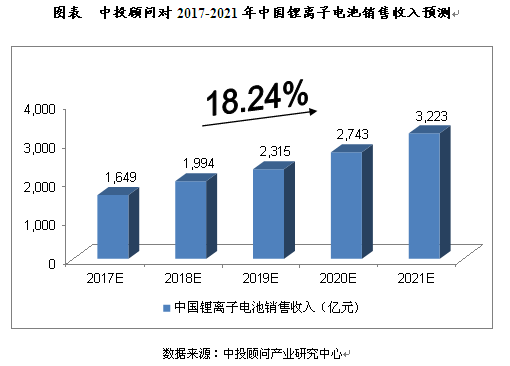 根據(jù)中國化學(xué)與物理電源行業(yè)協(xié)會統(tǒng)計分析,2016年中國鋰離子電池銷售收入達到1,330億元,同比增長35%。中投顧問發(fā)布的《2017-2021年中國鋰電池行業(yè)投資分析及前景預(yù)測報告》數(shù)據(jù)顯示:預(yù)計,2017年中國鋰離子電池銷售收入將達到1,649億元,未來五年(2017-2021)年均復(fù)合增長率約為18.24%,2021年中國鋰離子電池銷售收入將達到3,223億元。