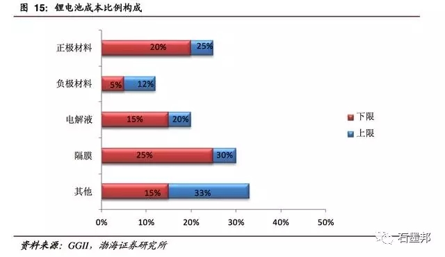 雖然動(dòng)力電池需求量的遞增,但各關(guān)鍵材料未來的市場及盈利仍存在較大差別。在鋰電池生產(chǎn)成本構(gòu)成中,正極材料占比 20%~25%,毛利率 10%~15%;負(fù)極材料占比 5%~12%,毛利率 10%~15%;電解液占比 15%~20%,毛利率超35%;隔膜占比 25%~30%,毛利率高達(dá) 55%以上,是鋰電池關(guān)鍵材料中盈利能力較強(qiáng)的部分。此外,作為電解液中的電解質(zhì),目前六氟磷酸鋰占電解液成本超 50%,目前毛利率高達(dá) 30%左右。