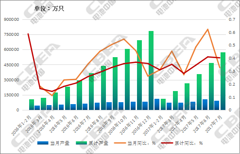 中國儲能網(wǎng)訊:國家統(tǒng)計(jì)局最新公布的數(shù)據(jù)顯示,2017年7月,全國鋰離子電池當(dāng)月產(chǎn)量為93567.6萬只,同比增長46.18%;1-7月累計(jì)完成總產(chǎn)量為571709.3萬只,同比增長55.99%。