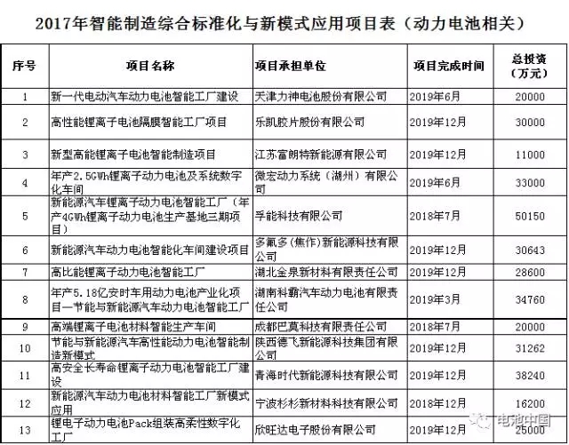 中國儲能網(wǎng)訊:近期,工信部發(fā)布《關(guān)于組織實施2017年智能制造綜合標(biāo)準(zhǔn)化與新模式應(yīng)用項目的通知》,確定了2017年智能制造綜合標(biāo)準(zhǔn)化與新模式應(yīng)用項目。其中涉及了13項與動力電池相關(guān)項目。這些項目分布預(yù)計到2018、2019年完成建設(shè)。