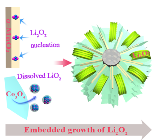 中國儲能網(wǎng)訊:鋰空氣電池因具有超高的理論能量密度而被認為是電動汽車的潛在動力電源。鋰氧電池的放電產(chǎn)物過氧化鋰(Li2O2)具有絕緣、不溶的特性,因此,隨著放電的進行,電極表面會逐漸被其鈍化而導致放電終止。大尺寸Li2O2的生成有助于延緩正極表面的鈍化、延長放電時間、提高電池容量。然而,大尺寸Li2O2在電極表面往往隨機散落,難以保證其與電極材料之間的有效接觸,從而限制了電池的倍率性能和能量效率。因此,亟需實現(xiàn)大尺寸Li2O2在電極材料中的嵌入式生長。