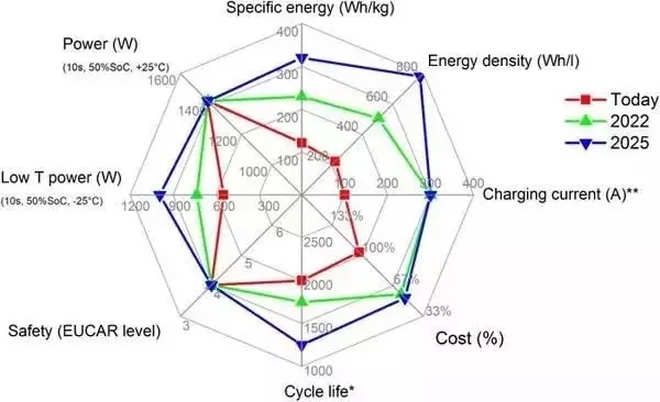 圖1 現(xiàn)有動力電池的技術(shù)指標(biāo)以及未來10 年的發(fā)展目標(biāo)