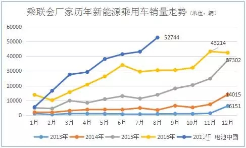 據(jù)全國乘聯(lián)會統(tǒng)計,2017年8月,乘聯(lián)會廠家的新能源乘用車銷量為5.3萬輛,同比銷量增加2.2萬輛,環(huán)比銷量增加近1萬輛。電池中國網(wǎng)對比發(fā)現(xiàn),在乘聯(lián)會統(tǒng)計的2013—2017年的銷量數(shù)據(jù)中,今年8月份新能源乘用車的銷量創(chuàng)造了歷史新高,這一方面說明新能源乘用車市場在逐步擴張,另一方面也說明了新能源汽車對傳統(tǒng)燃油汽車的取代開始加速。8月取得如此優(yōu)異的成績,主要得益于推薦目錄的定期公布以及7月份購置稅目錄的公布。