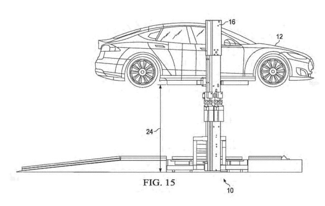 新專(zhuān)利文件包含了52頁(yè)草圖,它詳細(xì)介紹了系統(tǒng)的運(yùn)行原理,系統(tǒng)包括一套2柱式車(chē)輛提升機(jī)和相應(yīng)的電池提升機(jī)。