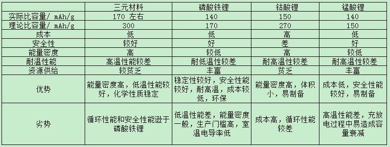 對比四種材料可以看出,三元材料、鈷酸鋰的理論比容量較高,磷酸鐵鋰、錳酸鋰的理論比容量和成本都比較低,鈷酸鋰在車用電池使用方面應(yīng)用成本較高,因此受下游市場以及自身生產(chǎn)狀況等因素影響,目前車用市場還是以磷酸鐵鋰和三元材料為主。