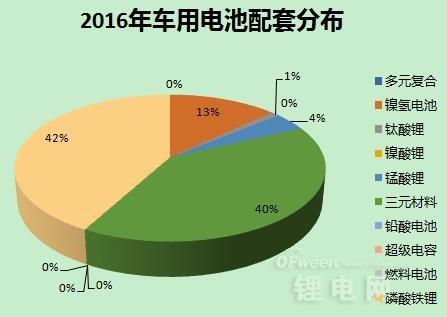 據(jù)行業(yè)調(diào)查顯示,2016年我國車用電池材料中,磷酸鐵鋰占42%、三元材料占40%、鎳氫電池占13%,其他的材料采用的比較低。