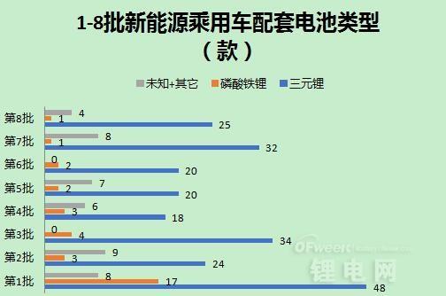 2017年工信部公布的8批共716款新能源專用車中,采用最多的是三元鋰,共有467款,磷酸鐵鋰的有188款,錳酸鋰的有26款,未知及其他的有35款。各批次新能源專用車配套電池具體情況如下: