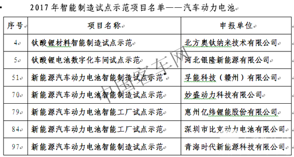 “2017年智能制造試點(diǎn)示范項(xiàng)目”18個汽車關(guān)聯(lián)項(xiàng)目中,新能源汽車動力電池就占了7個。