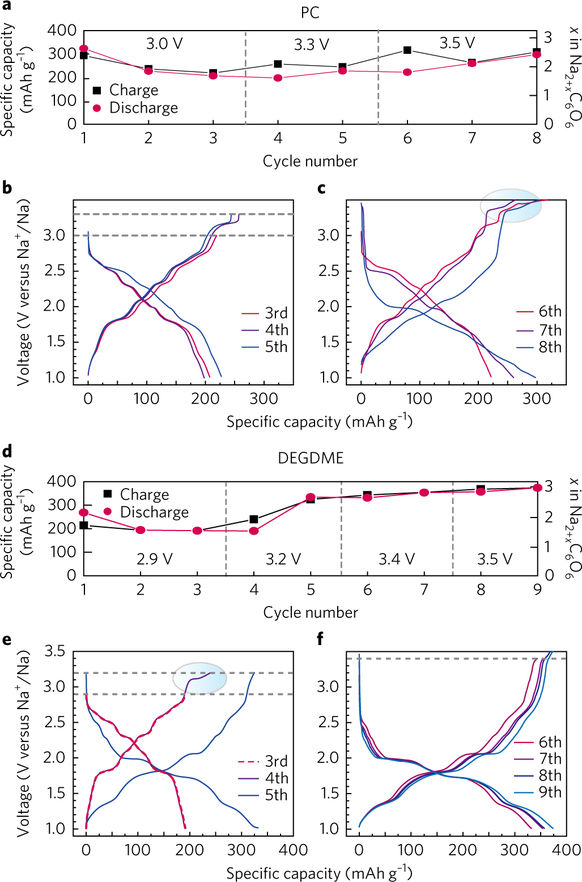 圖3:Na2C6O6在充鈉-去鈉(嵌納-脫納)過程中的電壓變化。
