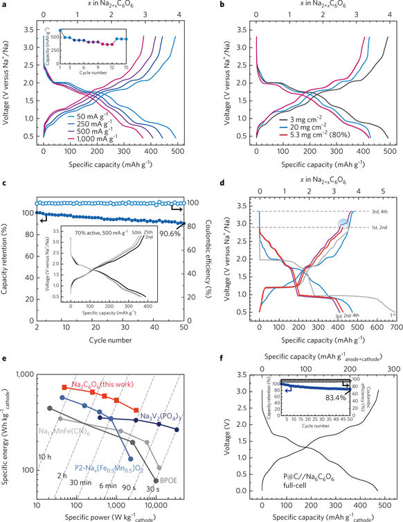 圖5:Na2C6O6電極在半電池和全電池中的電化學(xué)四儲(chǔ)鈉表現(xiàn)。