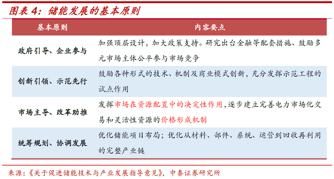 這次指導(dǎo)意見提出了儲(chǔ)能發(fā)展的四項(xiàng)基本原則:1)政府引導(dǎo)、企業(yè)參與;2)創(chuàng)新引領(lǐng)、示范先行;3)市場(chǎng)主導(dǎo)、改革助推;4)統(tǒng)籌規(guī)劃、協(xié)調(diào)發(fā)展。