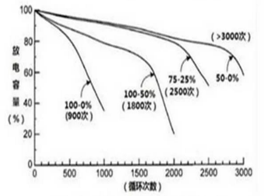 上圖為一三元鋰電池的充放電特性圖,可以看出,不同的充放電方式對電池的壽命影響不一樣,如上圖數(shù)據(jù),以25%-75%充放電的壽命可以達(dá)到2500次,即我們所說的電池淺充淺放。電池壽命這個話題我們以后還會深入討論。