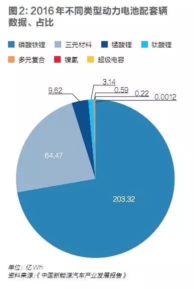 國內的動力電池以磷酸鐵鋰電池和三元電池為主,其中磷酸鐵鋰主要供應客車,三元電池主要供應中高端乘用車。新能源客車此前引領了國內新能源汽車的發(fā)展,因此,鐵鋰電池是當前國內電池產能的主力。中國汽車技術研究中心的數(shù)據(jù)顯示,2016年中國生產的新能源汽車中,磷酸鐵鋰電池總配套量為203.32億Wh,占比72.26%,其中的72%供應給純電動客車;三元電池總配套量為64.47億Wh,占比22.91%,其中的73%供應給純電動乘用車。