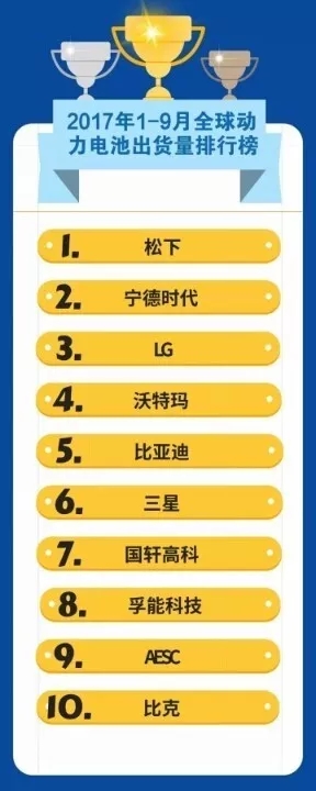 2017年1-9月全球動(dòng)力電池出貨量排行榜