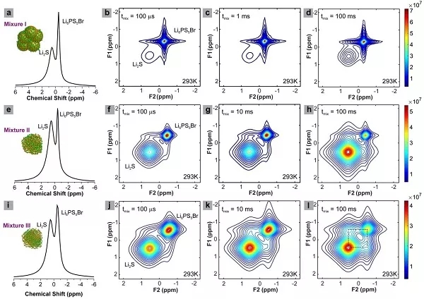 (其中Ⅰ-Ⅱ簡(jiǎn)單混合的樣品沒(méi)有明顯的“對(duì)角線外反十字峰”表明該過(guò)程鋰離子交換作用弱,而Ⅲ經(jīng)球磨法混合的樣品的“對(duì)角線外反十字峰”出現(xiàn)在10ms處,表明正極-固態(tài)電解質(zhì)界面明顯的鋰離子交換。)